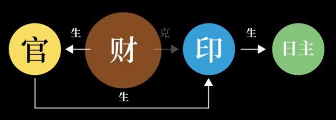 那财坏印怎么办呢?解药就是用官杀来通官,见了官杀,财就不去搞印的事情了,心甘情愿的去生官。官杀当然是跟印一头的,就把从财那里得到的能量转手就给了印,这就叫做流通。